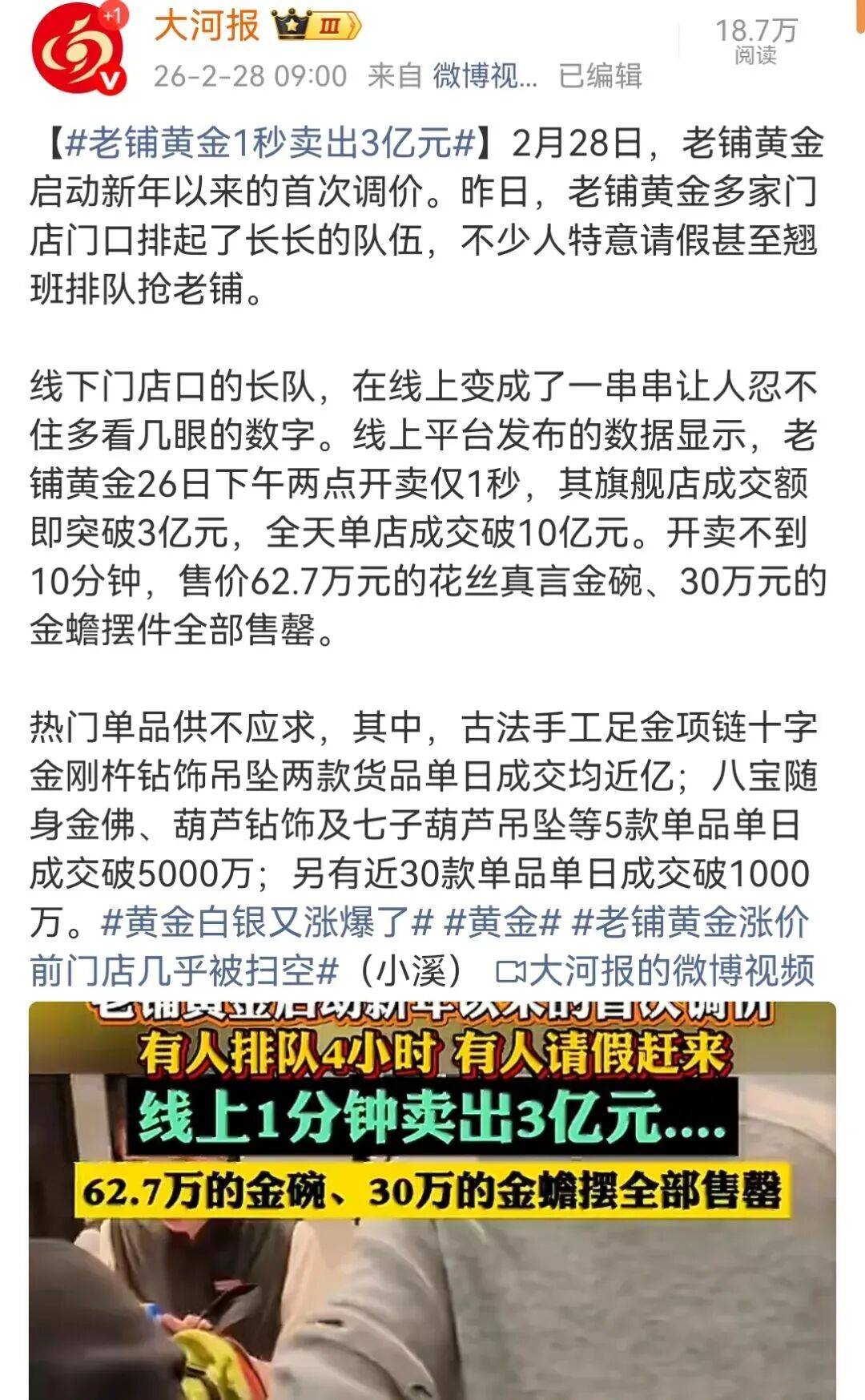 2月26日,天猫“3·8焕新周”大促正式开启,老铺黄金交出了一份令人瞠目的成绩单:开卖仅1秒,其天猫旗舰店成交额即突破3亿元;全天单店成交额突破10亿元,同比实现百倍增长。