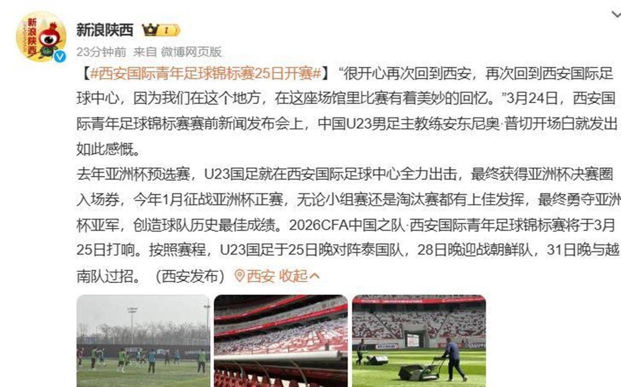 这场西安国际青年足球锦标赛,官方名称为“2026CFA中国之队·西安国际青年足球锦标赛”,是一项国际B级赛事。 比赛于3月25日至31日在西安举行,共有中国、泰国、朝鲜和越南四支U23国家队参加。 中国队的全部三场比赛都安排在黄金时间晚上7点35分,分别于25日对阵泰国、28日对阵朝鲜、31日对阵越南。 所有中国队的比赛都将在西安国际足球中心进行,这座刚刚入围“2025年度全球最佳体育场”评选的专业球场,正是去年U23国足开启亚洲杯预选赛征程的福地。