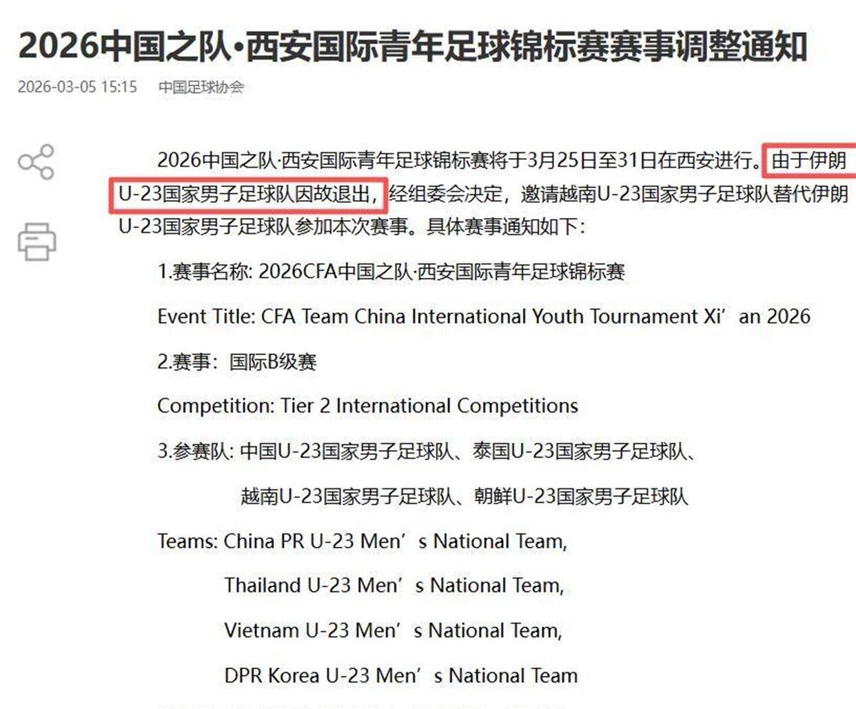 与阵容巨变相呼应的是赛事本身的意外。 本次四国赛最初的参赛队伍是中国、泰国、朝鲜和伊朗。 但伊朗U23国家队因故退出,经组委会决定,邀请越南U23国家队递补参赛。 这使得中国队的热身对手从一支身体强悍的西亚球队,变成了技术细腻的东南亚球队,更贴近亚运会可能遇到的对手类型。 然而,“伊朗退赛”在2026年3月,有着远超一场青年锦标赛的沉重含义。
